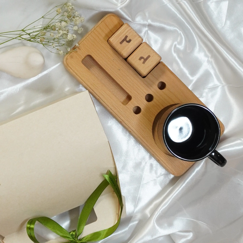 Wooden All-in-one Desk Gift Set - Puzzle Calendar, Pen Holder, Note Tray & Ceramic Mug