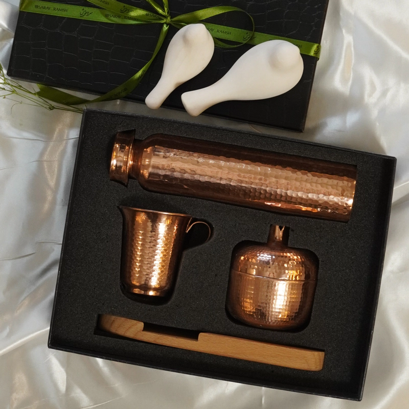 اقلام ست: قمقمه مسی، لیوان مسی، قندان مسی، هولدر چندکاره چوبی و جعبه هارد باکس.