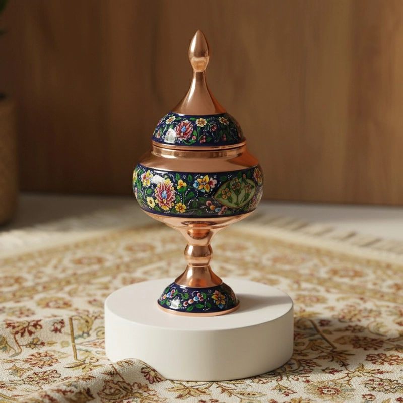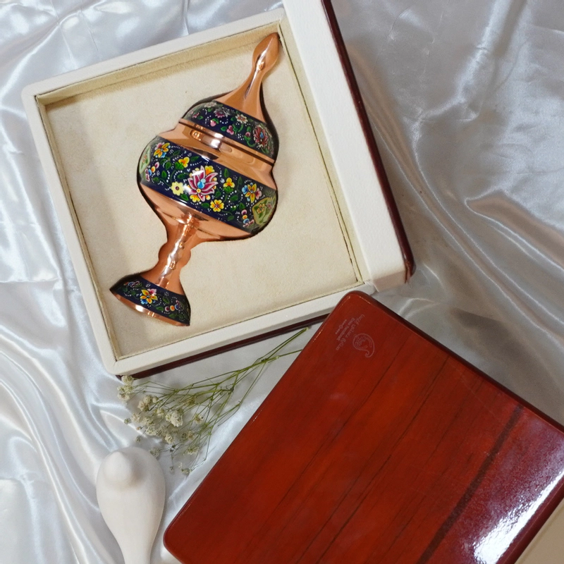 اقلام ست: شکلاتخوری مسی با پرداخت نقاشی ایرانی و جعبه هاردباکس.
