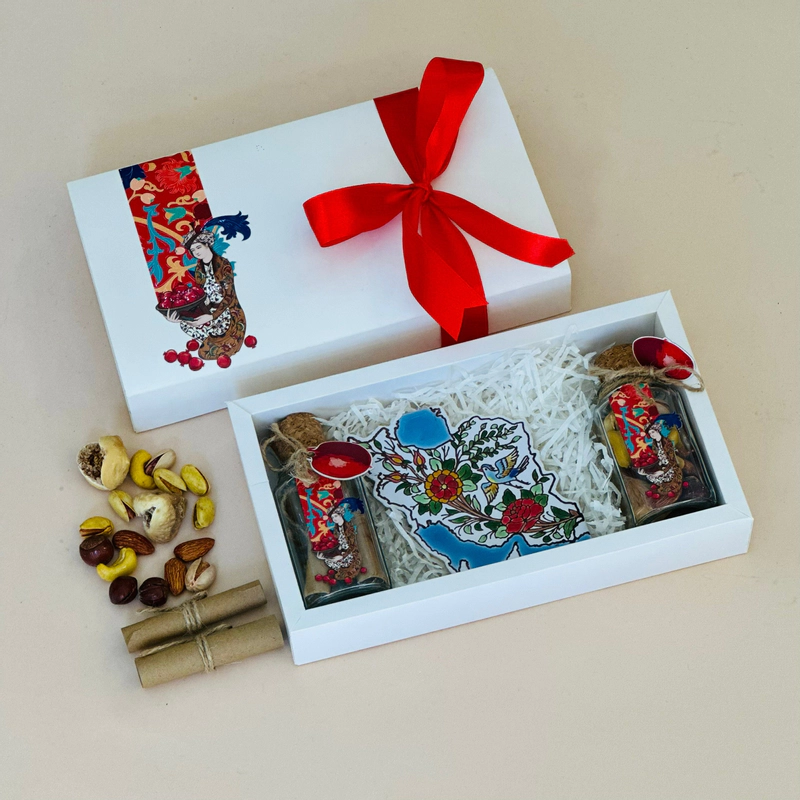 پکیج شب یلدا مدل سرزمین مهر با زیرلیوانی نقشه ایران، آجیل و فال حافظ