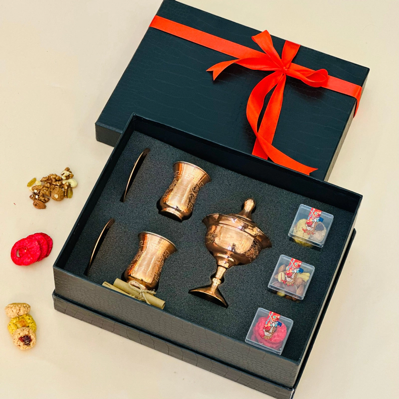 پکیج شب یلدا مدل آذرگون با ظروف مسی، آجیل، میوه خشک و فال حافظ