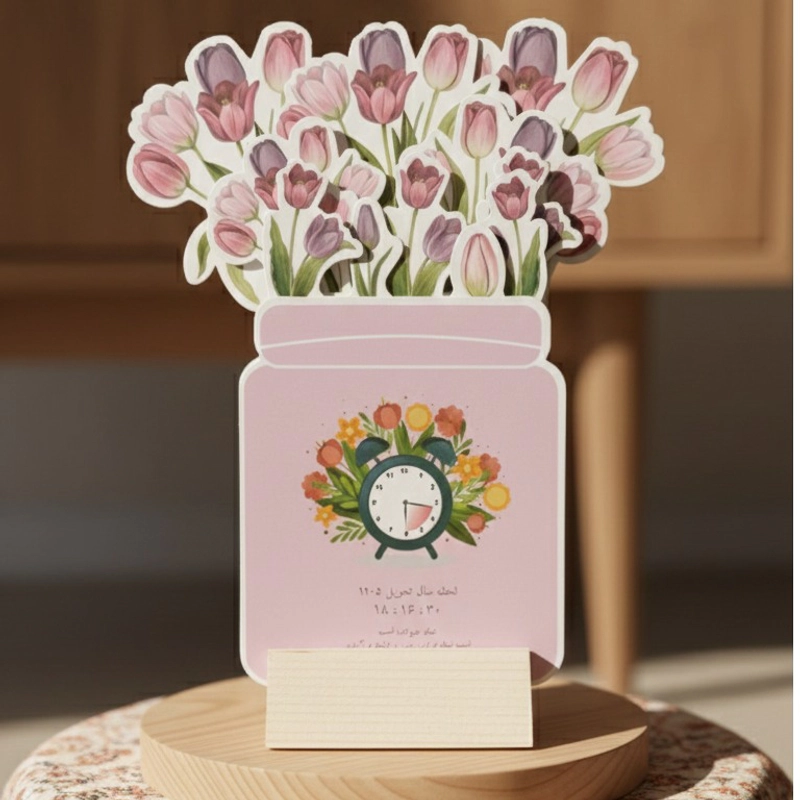 تقویم رومیزی شیک با طرح گلهای بهاری و پایه چوبی مقاوم. ترکیبی از زیبایی طبیعت و طراحی مینیمال برای میز کار یا منزل.